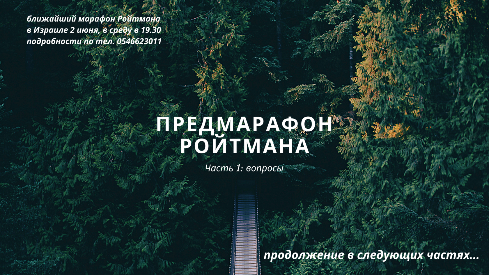| Ближайший марафон Ройтмана в Израиле 2 июня, в среду, в 19.30. У вас есть возможность прямо сейчас принять участие в виртуальном предмарафоне, познакомиться с Александром Ройтманом, его методом не по наслышке, а вживую, его группами, а также задать вопросы и взвесить для себя участие. Именно сегодня, именно в этот кризисный период жизни. |